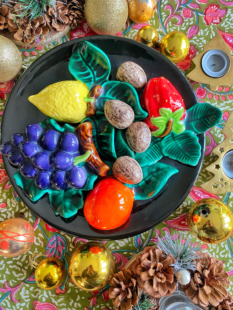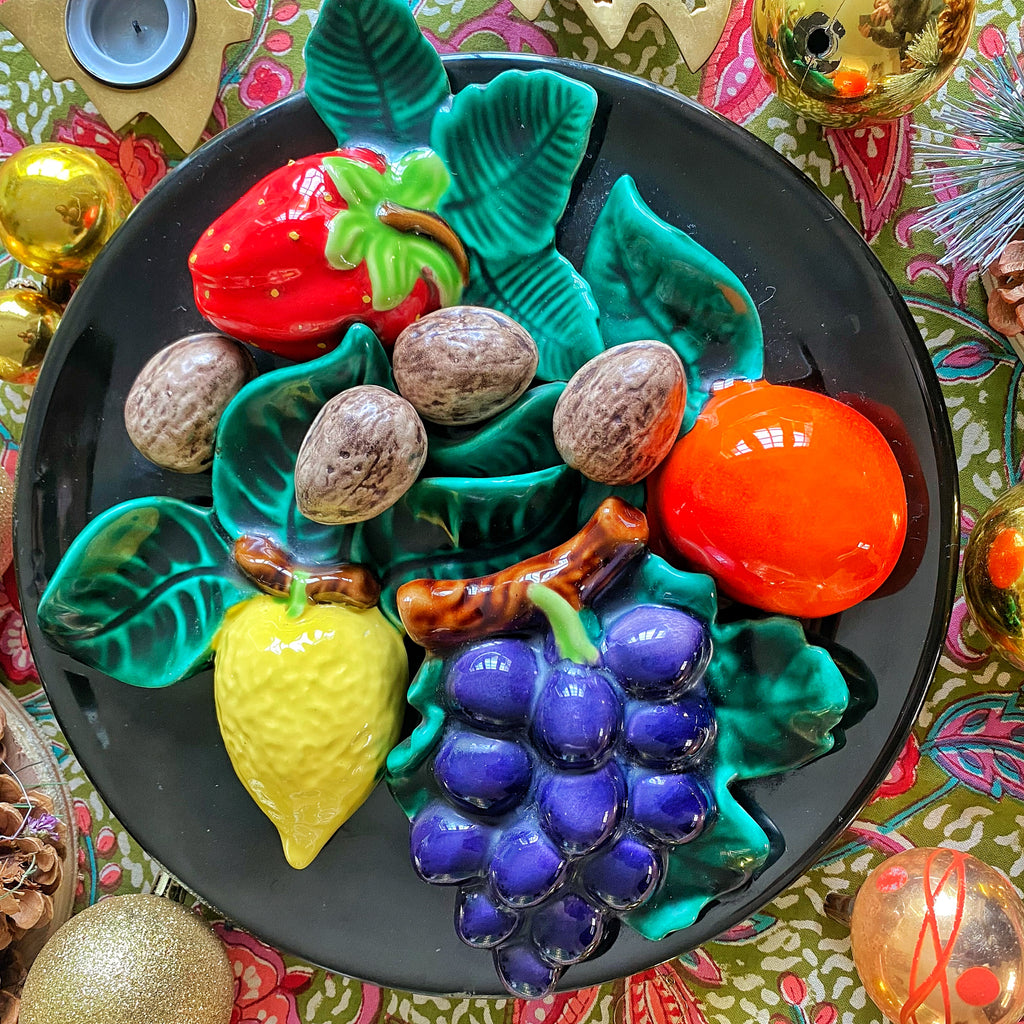 Magnifique assiette en trompe l’œil et en céramique d’albert ferlay. Décor de fruits en céramique et en relief