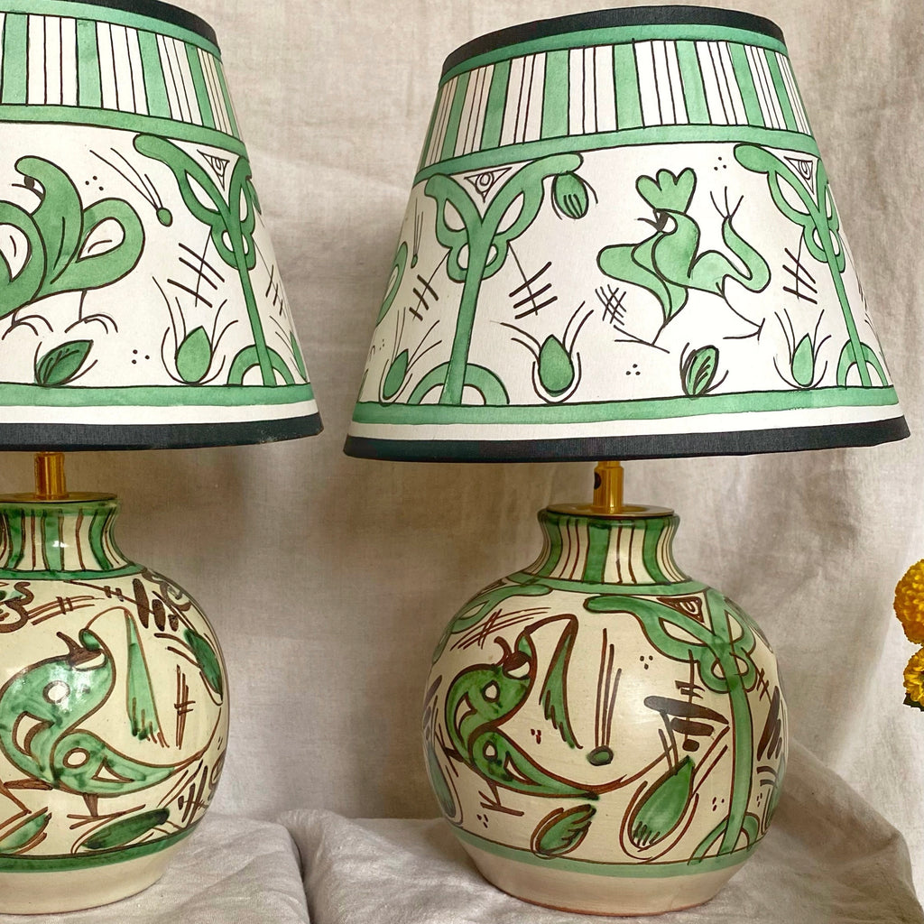Chaque pied est orné de motifs verts peints de façon traditionnelle et accompagné d’un abat-jour réalisé à la main et peint a l’aquarelle pour un ensemble naturellement harmonieux.
