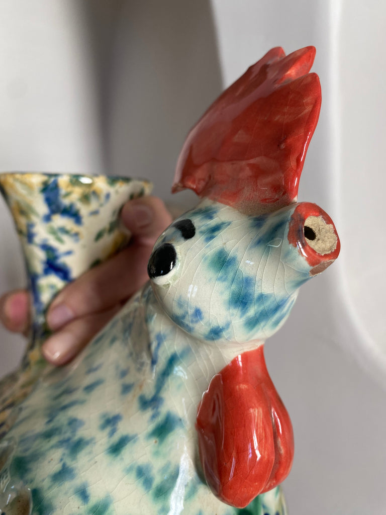 Extraordinaire et grand coq zoomorphe en terre cuite vernissée