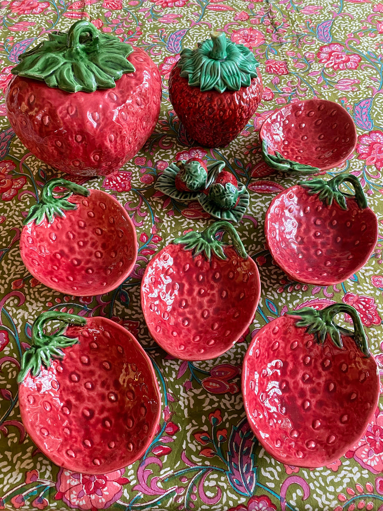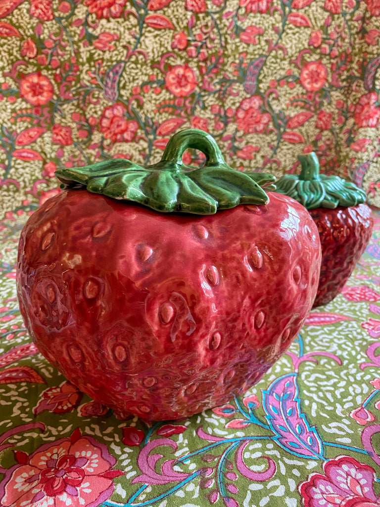 Grand pot / saladier en forme de fraise avec couvercle pédoncule vert, barbotine Vallauris en céramique du XXe siècle. Atelier AEGITNA.