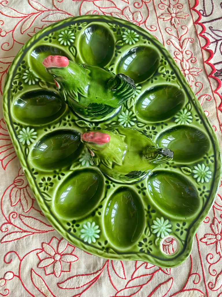 Plat à œufs vintage en faïence avec saliere poivrière poules